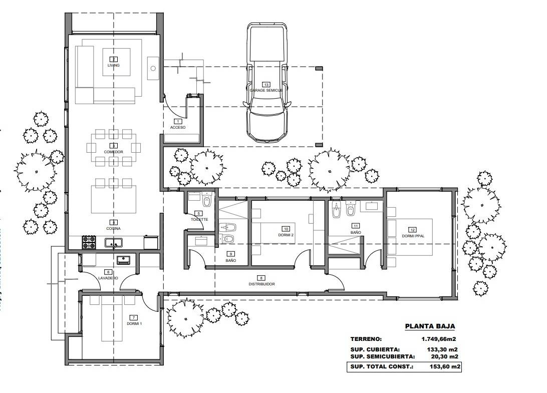 👉La construcción cuenta con una superficie cubierta de 📐133,47 m² y una superficie semicubierta de 📐23,00 m², alcanzando un total de 156,47 m² distribuidos en una sola planta. Su volumetría sencilla y sus líneas depuradas se complementan con un techo inclinado a dos aguas y generosas superficies vidriadas, que permiten una integración visual fluida con el paisaje circundante.